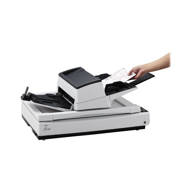 Der fi-7700S ist mit einem ADF (automatischer Dokumenteneinzug) ausgestattet, der sich nach rechts oder links bewegen oder um 180 Grad drehen lässt. Der Nutzer kann zu scannende Dokumente einfach einlegen, wenn er den ADF entsprechend seiner Büro- oder Arbeitsplatzumgebung einstellt. Das Bedienfeld verfügt über eine LCD, sodass der Status des Scanners leicht überprüft werden kann.
